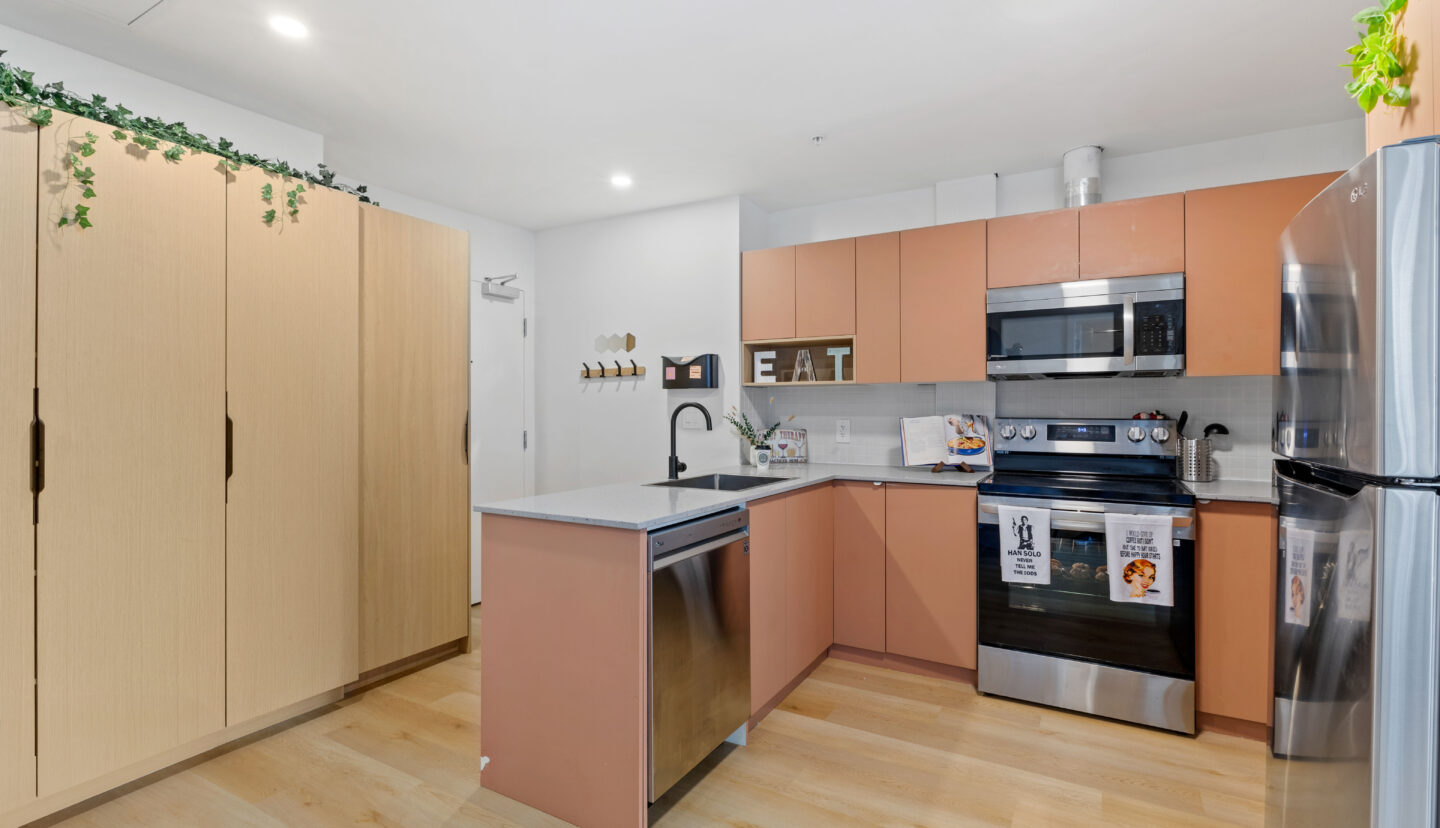 Cet appartement conçu sur mesure est entièrement équipé d’appareils électroménagers en acier inoxydable, d’une table et de chaises, d’un canapé et d’un meuble TV. Chaque chambre comprend un coin bureau avec un bureau et une chaise, un lit double, une armoire et des étagères supplémentaires.