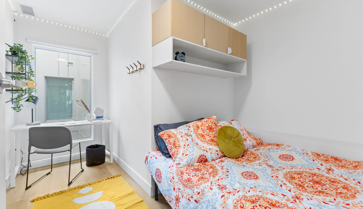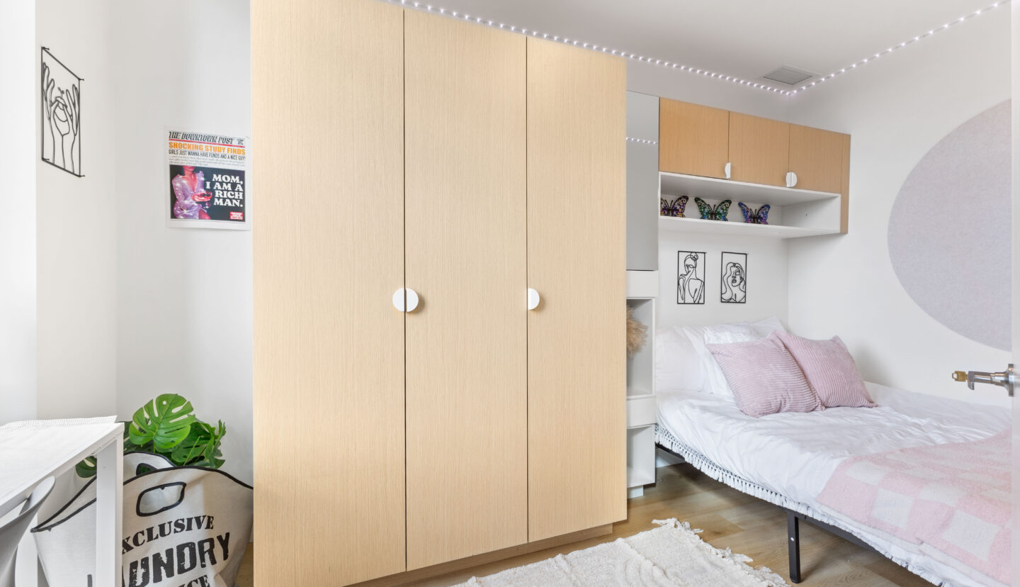 📚 Des armoires (assez grandes pour contenir des livres et tout ce dont vous pourriez avoir besoin) au-dessus du lit pour un rangement supplémentaire.